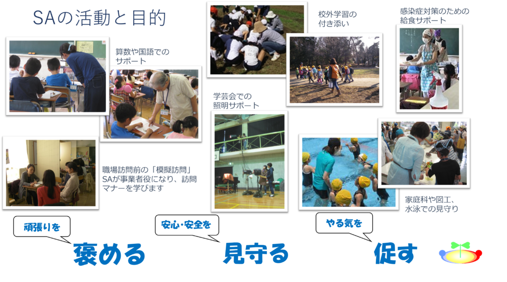 先生がた(プロ)の力100にSA(アマチュア)の力20が加われば、子どもたちの受け取るものは120になります。SAは子どもたちを励まし、やる気を促し、そうして『よくできたね!』『頑張ったね!』と褒めてあげられる『サポートのプロ』とも言うべき存在を目指します。